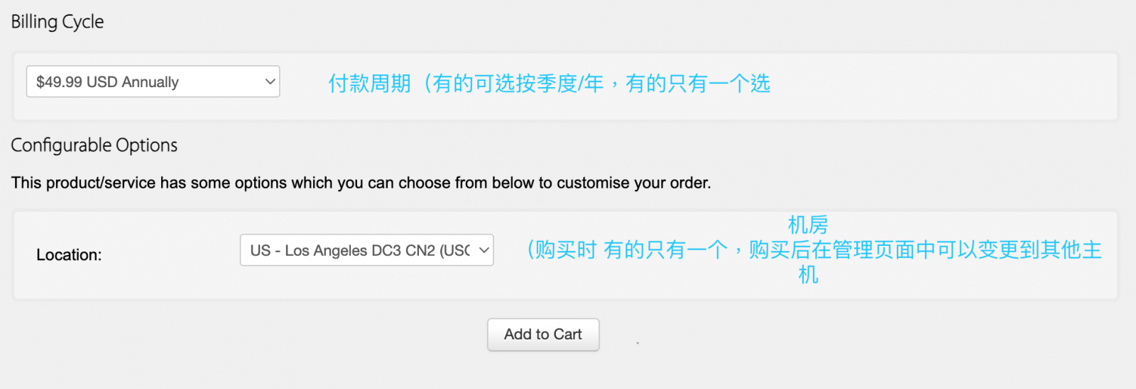 使用上面的推荐主机的链接点击进入页面后,选择付款周期和主机位置(在购买主机后,登录主机管理页面也可以变更机房)。点击 下面的 Add to Cart按钮 。通过上面的直接链接,则可跳过下一步;使用下一步中Order Now后,也会同样进入这个页面,进行相同操作即可。区别只在于上面的是单个主机的直接链接,下面是进入所有主机的选择页面。