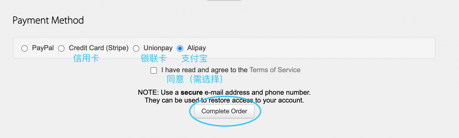 选择付款方式,国内一般可以选择支付宝或银联卡,之后选择同意协议,之后点击 【Complete Order】