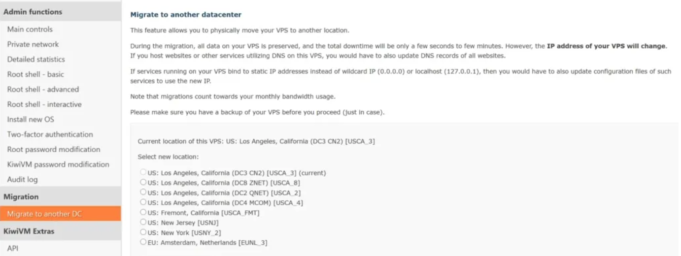 点击左侧菜单的 Migrate to another DC,如上图,即可变更机房,之后会进入下图,再这里选择要变更的目标机房。注意:变更机房有时会变更IP