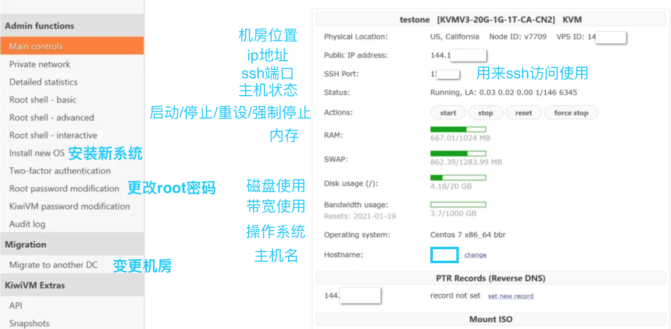 点击左侧菜单中的 Main controls,如下图。可以看到具体配置:内存、硬盘、流量、系统等等,也可以进行关机、重启等操作,同时可以看到登录SSH所需的IP地址以及SSH端口
