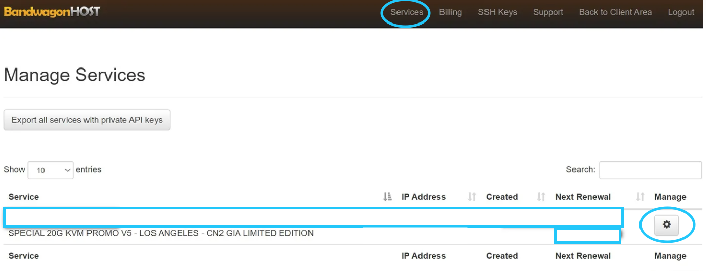 首先登录搬瓦工的后台,之后点击顶部的 Service,如下图。这时点击下方右侧的Manage按钮,这时会弹出 Open Kivi VM 的按钮,点击它即可进入 Kivi VM面板