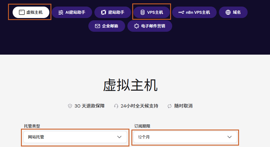 它默认进入的是虚拟主机(这里对应英文界面里的是Web Hosting),下面的托管类型为网站托管(Web Hosting),订阅期限可以选择之后下面显示相应的价格。订阅期限一定要买12个月及以上的,使用它的30天退款来做尝试,如果不行就退掉。购买一个月的价格太贵了,非常不划算。